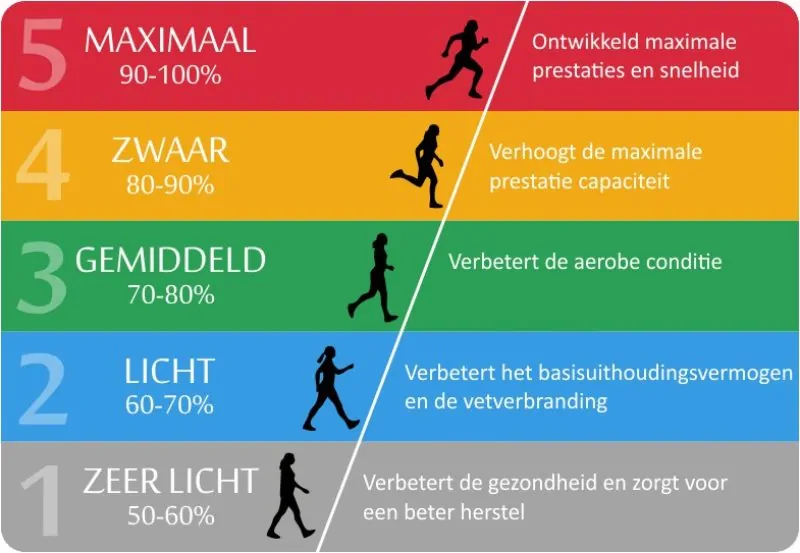 Er zijn 5 zones waar 'men' het over heeft, namelijk 1 tot en met 5! Zone 1 en 2 zijn de rustige duurlopen, herstel bevorderende lopen of lange duurlopen. Zone 3 is de zone waar je je tempolopen in loopt. Zone 4 en 5 zijn de zones die je bereikt tijdens intervaltrainingen, testlopen of wedstrijden.