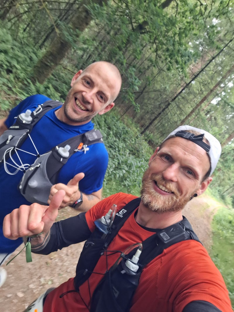 Maar ook bedankt, want je motiveert me gelijk weer om te gaan rennen. En vanaf kilometer 37 ging het weer een stuk lekkerder. Het tempo was weliswaar iets minder en de pittige klimmetjes moest ik dan wel wandelen, maar ik kwam weer helemaal in m'n bubbel. Ergens rond de 41 of 42 kilometer stond de laatste VP waar Joey mijn sportdrank aanvulde en ik van Patrick een bouillon kreeg. Dat was wel serieus lekker en ik had het ook wel nodig. Het regende inmiddels al een tijdje dus dit kon ik wel gebruiken. Nog een kilometer of 10 en dan waren we er weer. Ik stopte nog snel een bounty in mijn mond, een mars en snicker in mijn vest en lets go. Snackie voor onderweg!